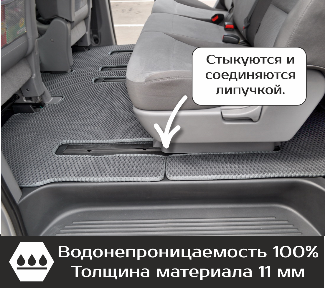 Толщина ковриков EVA составляет 10-12 мм. Глубина ячеек 7-8 мм. Такая толщина ковриков позволяет им служить довольно долго, не протираясь до 3 лет. А благодаря такой глубине ячеек коврик EVA площадью 1 кв.м. способен захватить около 3,5 л жидкости, сохраняя в чистоте вашу обувь и обивку салона.