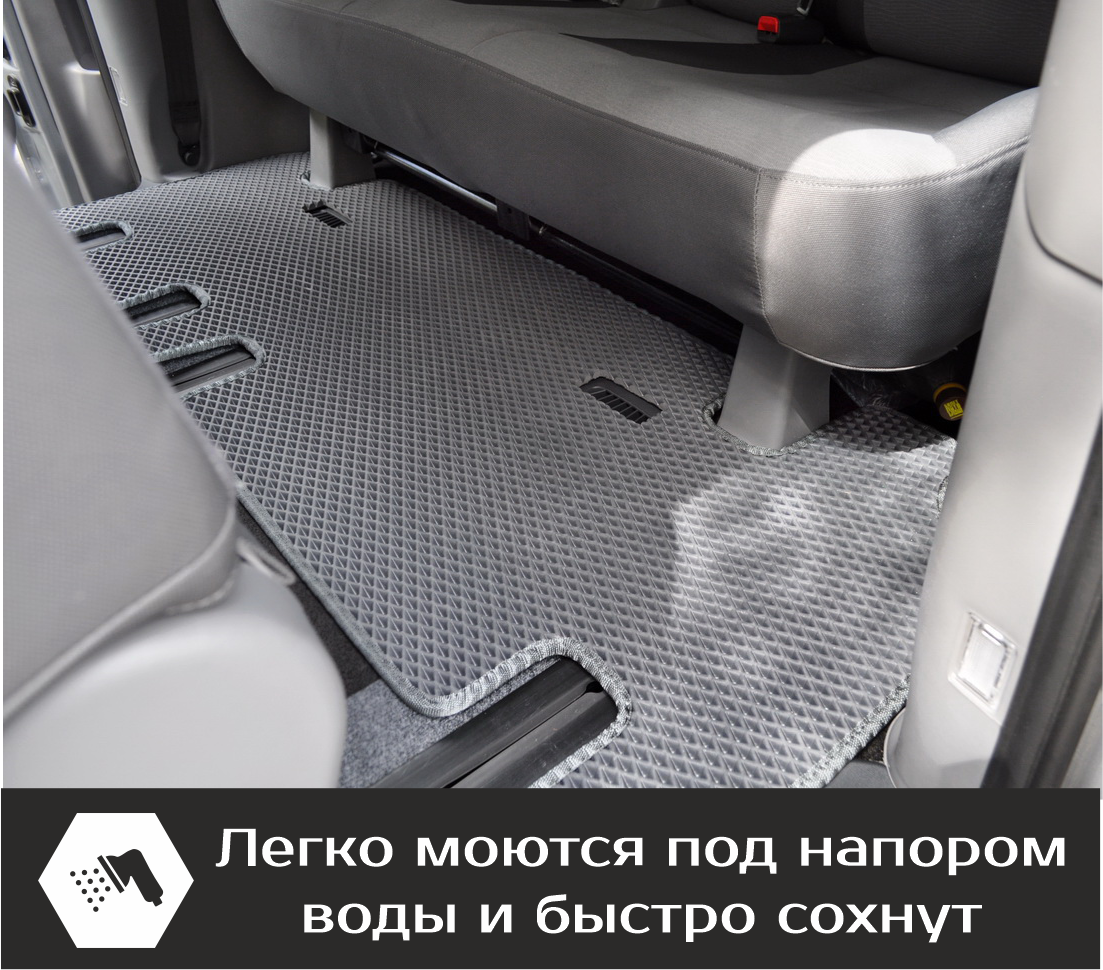Изделия EVA имеют специальную ячеистую структуру (ячейки глубиной 8 мм), которая эффективно задерживает грязь и воду, оставляя вашу обувь и поверхность обивки салона или багажника абсолютно чистыми. Также эти ячейки очень легко и быстро очищаются без применения специальных инструментов, в том числе, при помощи бесконтактной мойки.