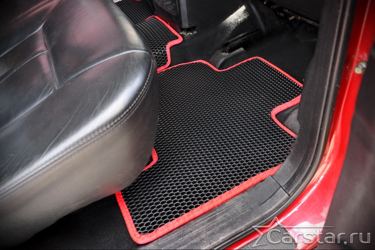 Толщина ковриков EVA составляет 10-12 мм. Глубина ячеек 7-8 мм. Такая толщина ковриков позволяет им служить довольно долго, не протираясь до 3 лет. А благодаря такой глубине ячеек коврик EVA площадью 1 кв.м. способен захватить около 3,5 л жидкости, сохраняя в чистоте вашу обувь и обивку салона.